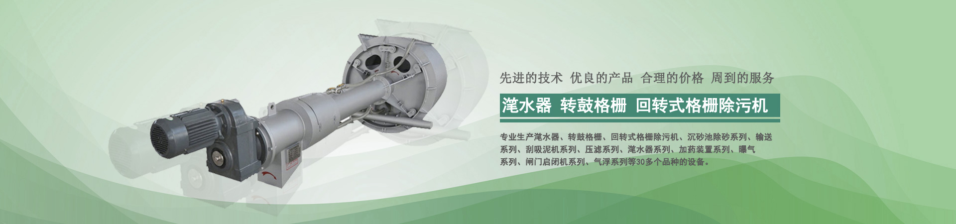 本公司目前專業生產轉鼓式精密過濾器、轉鼓格柵、回轉式格柵除污機、沉砂池除砂系列、輸送系列、刮吸泥機系列、壓濾系列、潷水器系列、加藥裝置系列、曝氣系列、閘門啟閉機系列、氣浮系列、曝氣器系列、填料系列等30多個品種的設備...